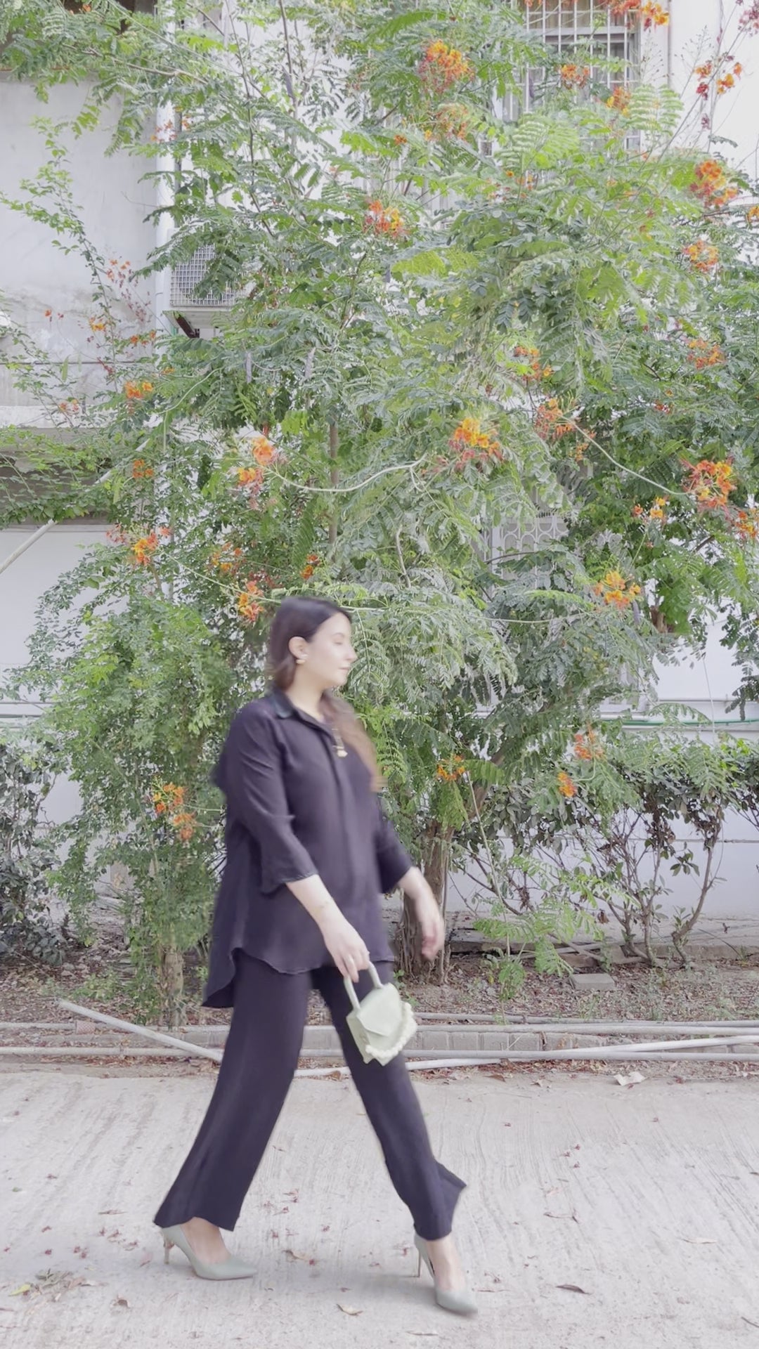 Black crinkle georgette button down with teal embroidery at the back, collar & sleeves paired with flared pocket pants.